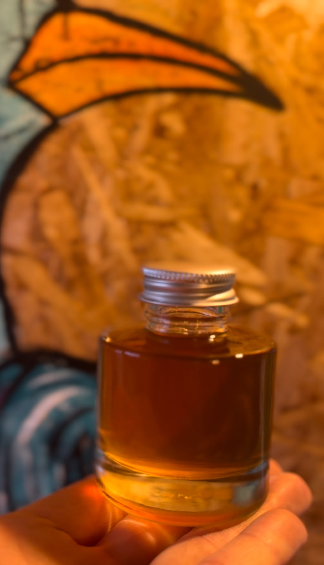 Packaging: clear glass bottle, wooden cap with plastic liner (reusable), rattan reeds.